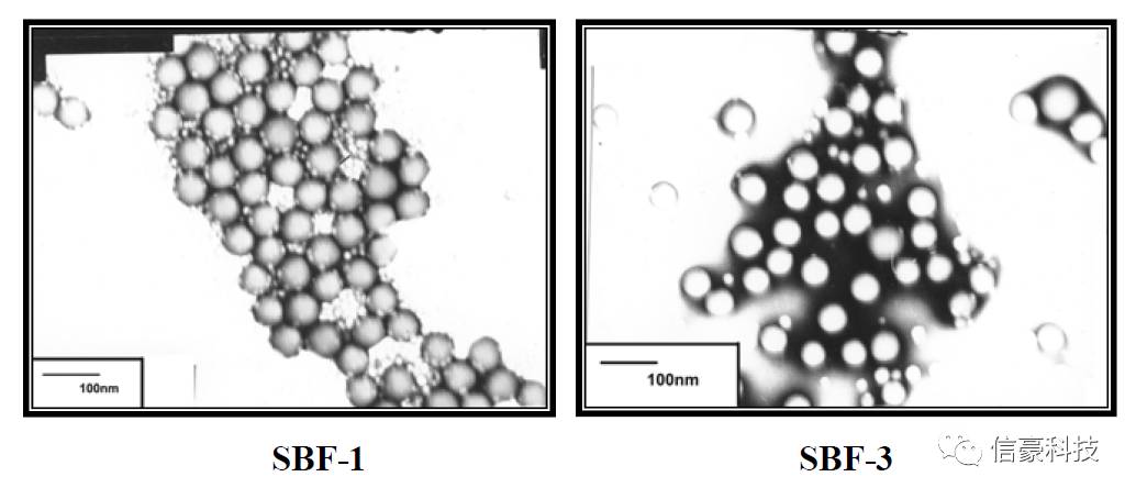 圖3為SBF-1和SBF-3的電鏡照片,從下圖中可以看出SBF-1乳液中乳膠粒子相對于SBF-3的乳膠粒子內外反差更大,其核/殼結構更為明顯,粒徑也更為均勻。