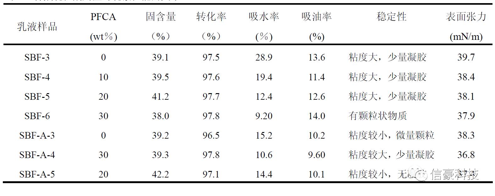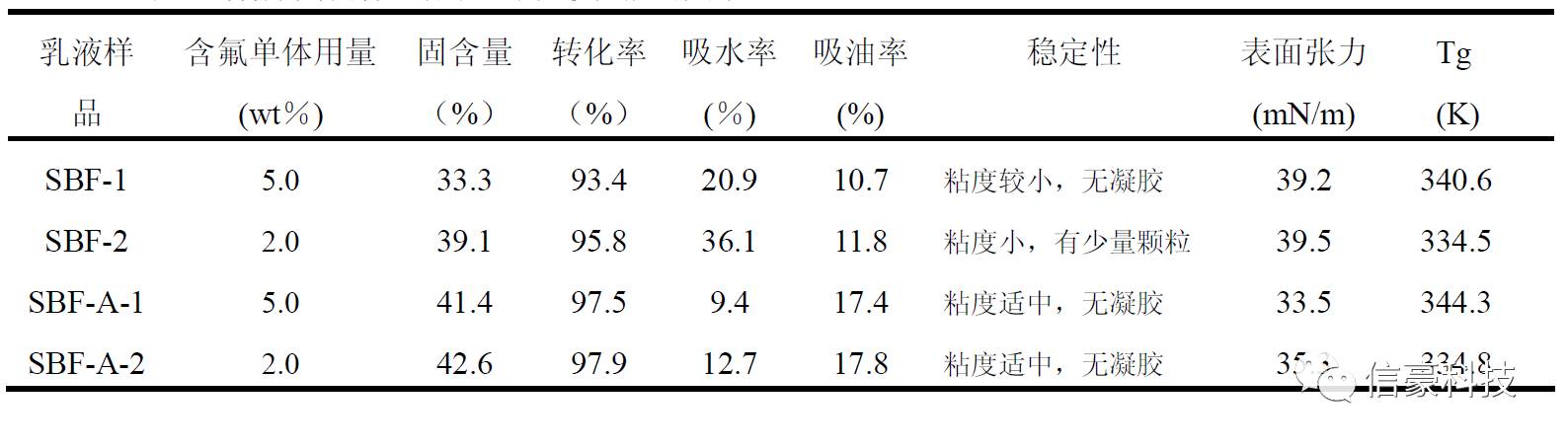由上表可以看出,采用超聲預乳化工藝合成的乳液SBF-1的單體轉化率明顯高于采用常規單體加料方式所合成的乳液SBF-3。并且采用超聲預乳化工藝相對于單體直接滴加的工藝,前者可使共聚單體混合更加均勻,避免單體珠滴從水相體系中吸附乳化劑,從而提高乳液的穩定性與共聚單體的轉化率。同時,采用該種預乳化工藝合成的乳液,表面張力略低于后者,因此,其乳膠膜的抗水、抗油性較好。